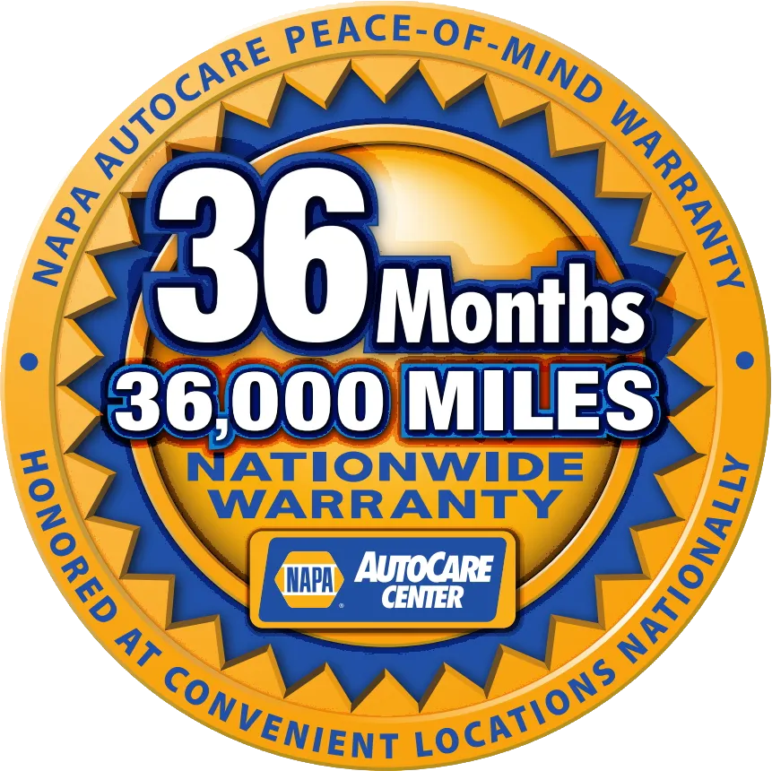 We’re proud to offer a NAPA Nationwide Warranty for your vehicle! Our warranty covers 36 months/36,000 miles on repairs, including parts and installations, as well as includes 36 months of emergency roadside assistance!